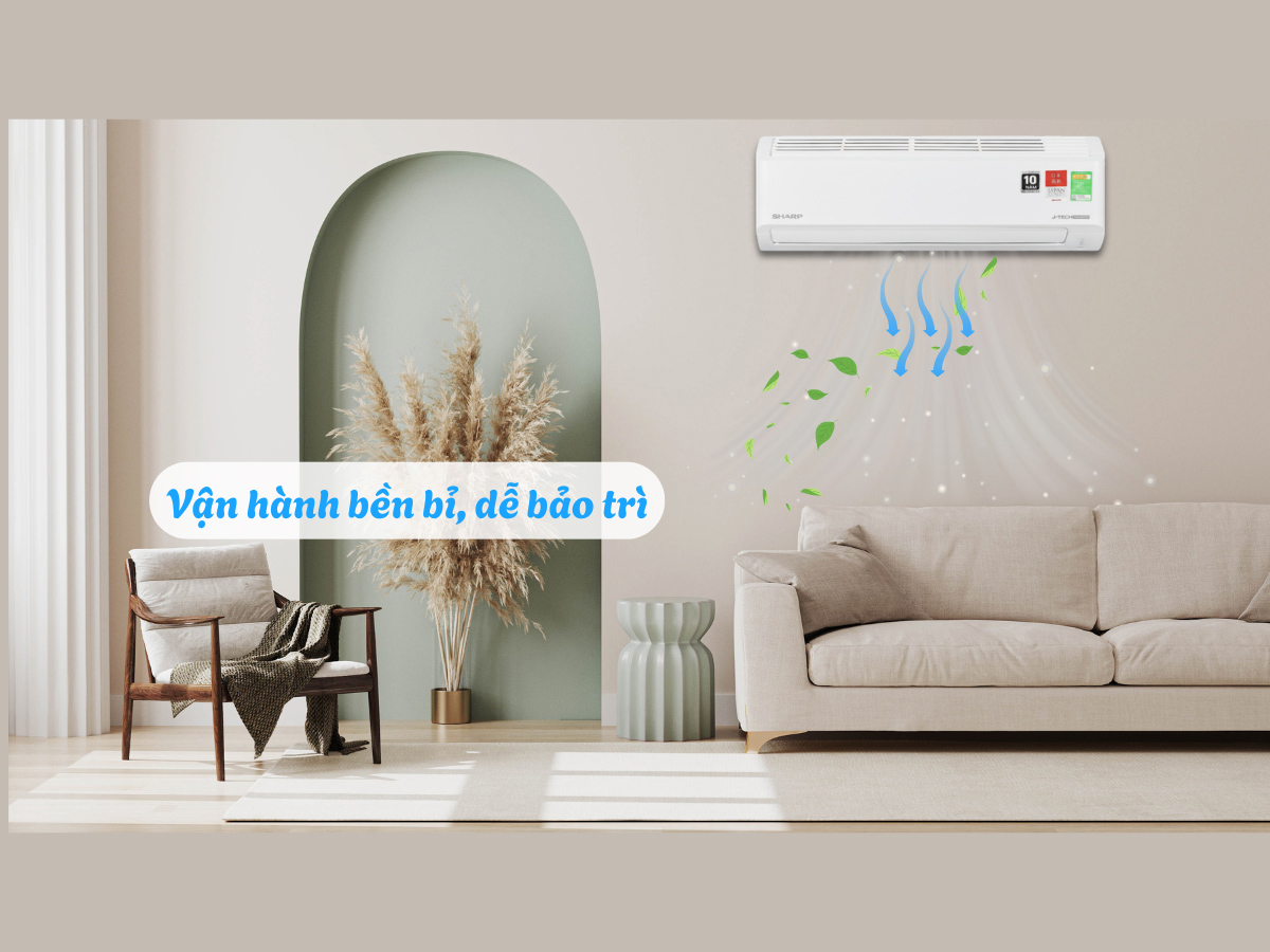 Máy lạnh Sharp nổi tiếng với độ bền cao, ít hỏng vặt. Dàn tản nhiệt được phủ lớp chống ăn mòn giúp tăng tuổi thọ thiết bị, đặc biệt trong môi trường khí hậu nóng ẩm như Việt Nam. Ngoài ra, việc vệ sinh và bảo trì cũng khá đơn giản.